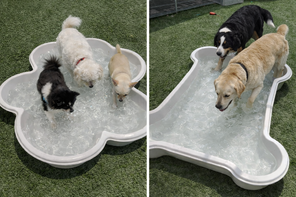 Dogs are grouped by size and temperament, and water play is always monitored to ensure safety and comfort.