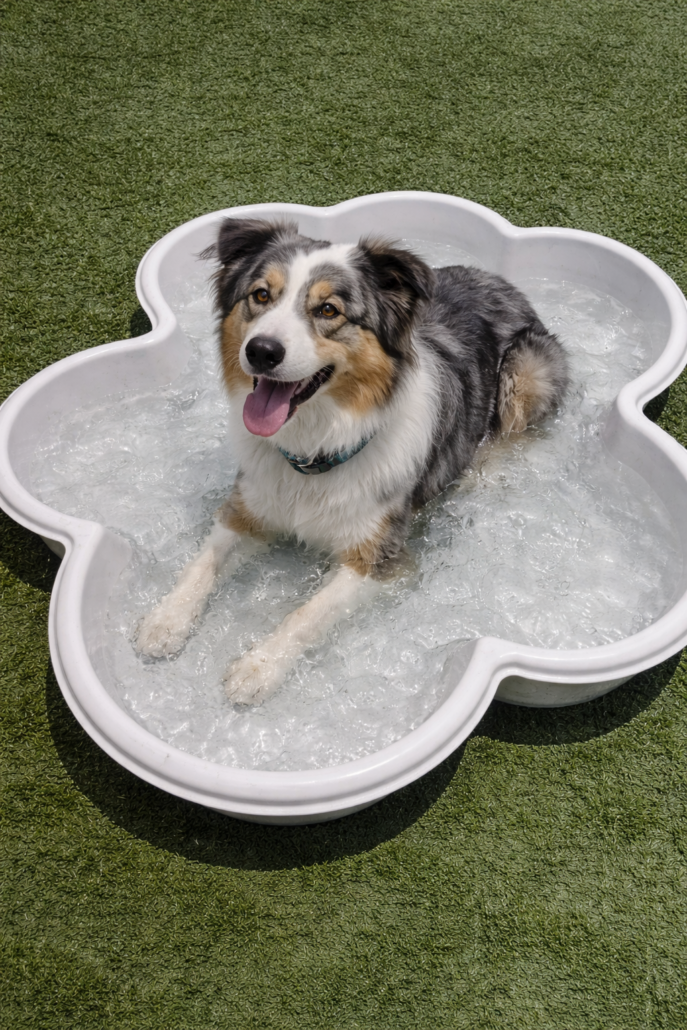 Some dogs enjoy cooling off in the pool, while others prefer to relax and observe – each dog participates at their own comfort level.
